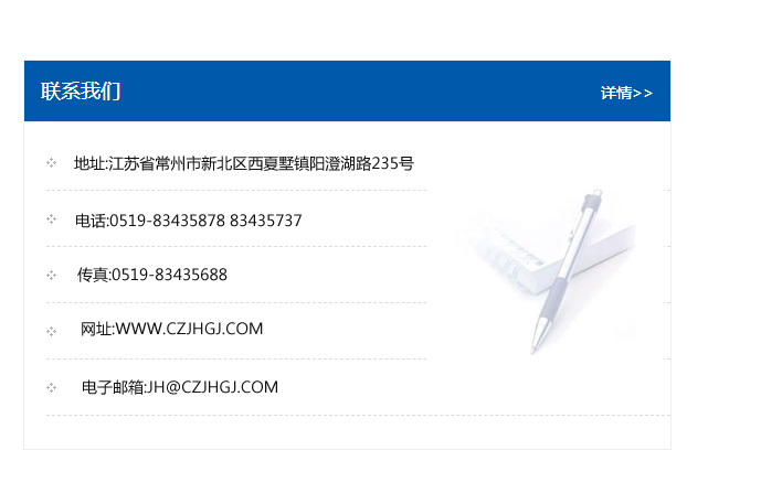 地址:常州市新北區友邦商務大廈1幢16、17層  電話:0519-85101652  傳真:0519-85112595  郵編:213022  網址:www.cz-jiayue_cn.cqjykyj.com  郵箱:xiajifengaa@163.com